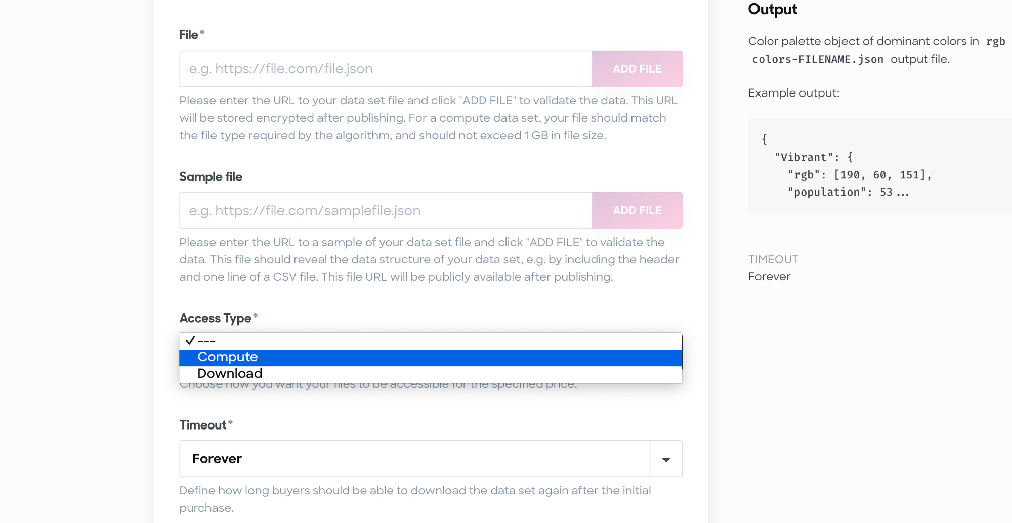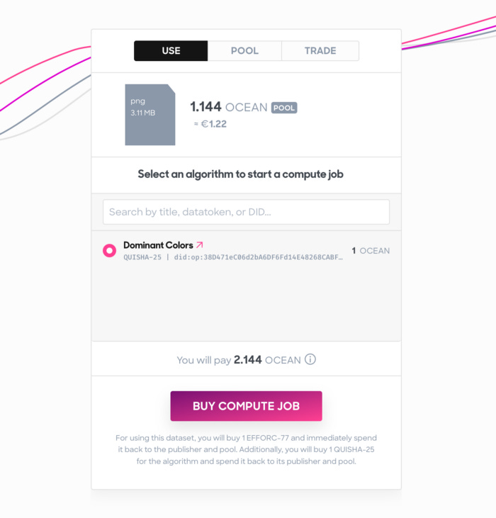 Μεταβείτε στο σύνολο δεδομένων που θέλετε να αναλύσετε. Στην καρτέλα Χρήση (Use), μπορείτε να επιλέξετε από μια αναπτυσσόμενη λίστα επιτρεπόμενων αλγορίθμων ποιους αλγορίθμους θέλετε να εκτελέσετε στο σύνολο δεδομένων. Επιλέξτε τον αλγόριθμο και, στη συνέχεια, κάντε κλικ στην επιλογή Αγορά Εργασίας Υπολογισμού (Buy Compute Job). Με αυτόν τον τρόπο αγοράζετε (υπολογιστική) πρόσβαση και στα δύο στοιχεία: στο σύνολο δεδομένων (για τη διάρκεια που έχει ορίσει ο εκδότης δεδομένων) καθώς και στον αλγόριθμο.